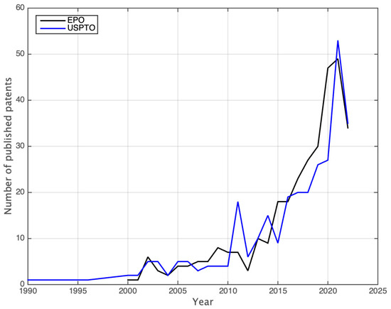 Relevant technological throughputs are often published as patents in order to grant intellectual property rights to the authors. It is important to note that patent applications and the process for their publication follows a procedure that is dramatically different from the one of scientific publications, and technical language is often used in combination with economic and legal terms, in order to provide a solid legal ground for protecting the technology as much as possible. For this reason, we focus our attention on patents that contain the keywords “laser induced forward transfer” from two public patent office databases, considering that the majority of publications on LIFT are located in these two regions according to Figure 6. These patent office databases are the European Patent Office (EPO) and the United States Patent and Trademark Office (USPTO). Based on this premise, we select patents publications that are publicly accessible and published with an assigned patent publication number, regardless of the acceptance or licensing status. In the following data we, therefore, jointly present patents with patent applications. We find 321 patents reported in the EPO and 303 in the USPTO, that, regardless of the publication country, are reported in these databases. Due to the large number of items, the specific lists are included as a Supplementary Material. The following plot in Figure 7 shows the number of patents and patent publications over time, considering the early publication date for the EPO results and the publication date for the USPTO results.