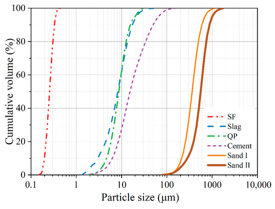 Type II Portland cement, granulated blast furnace slag (GBFS), and densified silica fume (SF) were used as cementitious materials, and a superfine quartz powder (QP) was used as filler to replace cementitious materials. Two types of quartz sand with different size ranges were selected as fine aggregates. The chemical compositions and particle size distribution of particles are summarized in Table 1 and Figure 1. The physical properties and particle size statistics of the above materials are listed in Table 2. A polycarboxylic acid superplasticizer (SP) with a solid content of 33.0% was used to adjust the workability of the UHPC matrix. Steel fiber with a length of 13 mm and a diameter of 0.2 mm was used to prepare fiber-reinforced UHPC.