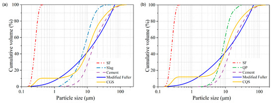 Particle size distribution of cementitious material: (a) CGS system; (b) CQS system.