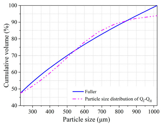 The subintervals and the composition of aggregate systems were determined according to the method for the cementitious material system. For the binary aggregate system formed by particles QI and QII, the particle distribution range of this system was divided into two subintervals, which were 229.08–394.24 μm and 394.24–1019.50 μm. The results showed that the RSS was minimized, which can be seen as visualized in Figure 3 when the volumes of QI and QII accounted for 25.0% and 75.0%, respectively.
