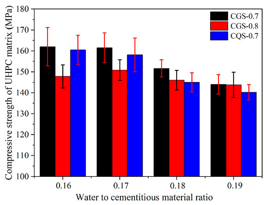 Under the same W/C, the compressive strength decreased with the increase in the A/C of the UHPC matrix. However, with the increase in the W/C, the difference between the CGS-0.7 and CGS-0.8 systems in terms of compressive strength decreased gradually. For example, the compressive strength difference between the CGS-0.7 and CGS-0.8 systems decreased from 14.2 MPa to 0.2 MPa when the W/C increased from 0.16 to 0.19. When the W/C ranged from 0.16 to 0.19, the compressive strength of the UHPC matrix for the CGS system was 1.5–6.6 MPa higher than that of the CQS system since the GBFS with higher reactivity could produce more hydration products and resulted in a denser microstructure of the UHPC matrix [31,32].