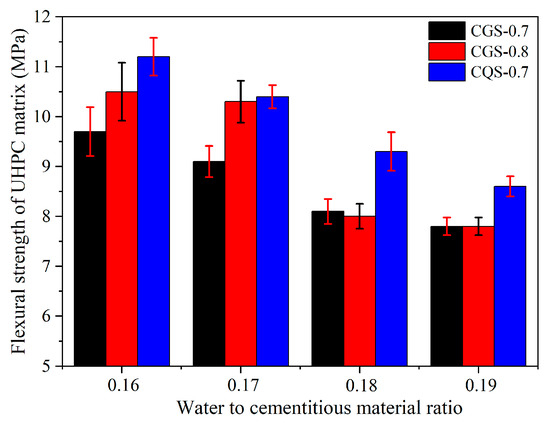 As shown in Figure 6, the flexural strength of all UHPC matrices decreased with the increase in the W/C. When the A/C increased from 0.7 to 0.8, the flexural strength of the UHPC matrix in the CGS series increased by 8.2% and 13.2% for the W/C at 0.16 and 0.17, respectively. In contrast, the difference between the CGS-0.7 and CGS-0.8 systems in flexural strength was insignificant when the W/C was larger than 0.18. Compared with the flexural strength of UHPC for the CGS system, the CQS system had a higher flexural strength under the same W/C, which was inconsistent with the compressive strength of the UHPC matrix. Due to the higher hydration degree of GBFS than QP in UHPC, the shrinkage of UHPC using GBFS was greater, resulting in more microcracks and defects in the UHPC [33]. Therefore, the flexural strength of the UHPC matrix for the CGS system was lower than that of the CQS system.