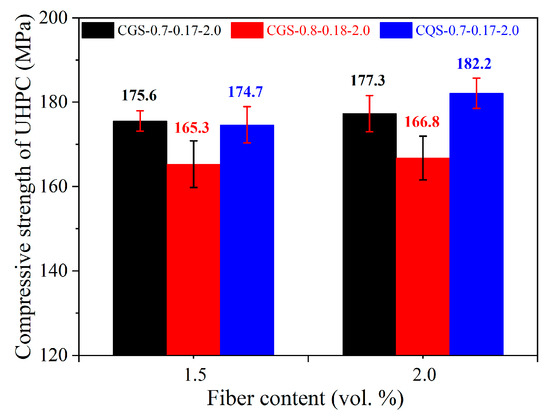 As shown in Figure 7, the compressive strength of UHPC gradually increased with the steel fiber volume fraction increase. Combined with Figure 4, the UHPC in the CQS-0.7-0.17 system showed the largest compressive strength increase when the steel fiber volume fraction increased from 0% to 2.0%. Under the same steel fiber fraction, the compression strength of the UHPC in the CGS-0.7-0.17 system was higher than that in the CGS-0.8-0.18 system, which was consistent with the findings in Section 4.1. When steel fiber was not used, the compressive strength of the UHPC matrix was reduced by replacing GBFS with QP. However, the compressive strength of the UHPC matrix was improved slightly by replacing GBFS with QP when the volume fraction of steel fiber was 2.0%.