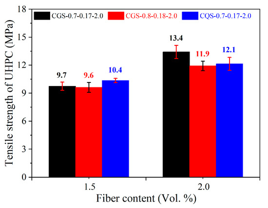 Compared with the compressive strength of UHPC, the tensile strength of UHPC increased significantly with the fiber volume fraction (Figure 8). When the steel fiber volume fraction rose from 1.5% to 2.0%, the tensile strength of the UHPCs increased by 16.3–38.1%. The difference between the CGS-0.7-0.17 and CQS-0.7-0.17 systems in terms of tensile strength was insignificant when the steel fiber with a volume fraction of 1.5% was used, while the tensile strength of the former was 10.7% higher than that of the latter when the volume fraction of steel fiber was 2.0%. The phenomenon can be attributed to the fact that GBFS with higher hydration activity generated more hydration products on the fiber surface and strengthened the fiber–matrix interface [34]. Although the shrinkage and initial microcracks of UHPC increased when GBFS was used, the steel fiber could effectively inhibit the generation of microcracks and the expansion of macroscopic cracks [13], resulting in the higher tensile strength of the UHPC.