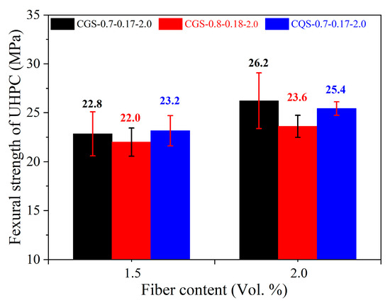 When the volume fraction of steel fiber increased from 1.5% to 2.0%, the UHPC in the CGS-0.7-0.17 system showed the highest increase in flexural strength, as shown in Figure 9. Under the same steel fiber fraction, the flexural strength of UHPC in the CGS-0.7-0.17 system was higher than that of the CGS-0.8-0.18 system, which was consistent with the flexural strength of the UHPC matrix. Combined with Figure 6, it can be seen that replacing the GBFS with QP enhanced the flexural strength of the UHPC matrix, while the flexural strength of the UHPC in the CGS-0.7-0.17 system was the highest when the fiber fraction was 2.0%. It can be inferred that an increase in steel fiber dosage may promote a more significant enhancement of GBFS on the flexural strength of UHPC.
