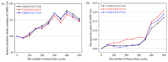 As shown in Figure 10a, the relative dynamic elastic modulus of the UHPCs decreased slightly after 50 cycles of freezing and thawing. However, with the further increase in the number of freeze–thaw cycles, the relative dynamic elastic modulus of the UHPCs increased somewhat. When the number of freeze–thaw cycles reached 500, the relative dynamic elastic moduli of the UHPCs were 101.1%, 100.9%, and 101.0% for CGS-0.7-0.17-2.0, CGS-0.8-0.18-2.0, and CQS-0.7-0.17-2.0, respectively. This phenomenon can be attributed to the fact that the microstructure of UHPC is very dense and consequently has a low permeability [35,36]. In addition, the water content in UHPC is meager due to its low W/C. Thus, there are a large number of unhydrated cementitious material particles [37,38]. With the continuous hydration reaction, the microstructure of UHPC becomes denser during the testing process, resulting in a slow increase in the relative dynamic elastic modulus of UHPC [39].