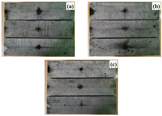 The surface of the UHPC after 500 freeze–thaw cycles: (a) CGS-0.7-0.17-2.0; (b) CGS-0.8-0.18-2.0; (c) CQS-0.7-0.17-2.0.