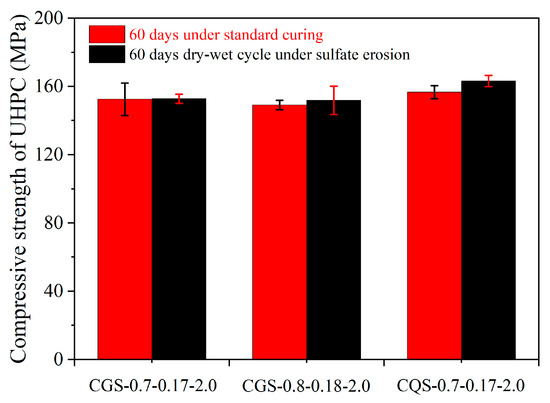 The compressive strength of UHPC after standard curing or dry–wet cycles under sulfate erosion is shown in Figure 12. The compressive strengths of UHPCs cured at 60 days under standard curing conditions were 152.6 MPa, 149.2 MPa, and 156.6 MPa for CGS-0.7-0.17-2.0, CGS-0.8-0.18-2.0, and CGS-0.7-0.17-2.0, respectively. Compared with the UHPC cured under standard curing conditions, the compressive strengths of UHPCs after 60 days of sulfate erosion under the dry–wet cycle were increased by 0.2%, 1.8%, and 4.2%, respectively. This phenomenon was similar to the relative elastic modulus of UHPC in the freezing–thawing test. It can be attributed that the permeability of UHPC was very low, and the compressive strength was further increased due to the heating process during the dry–wet cycles [40].