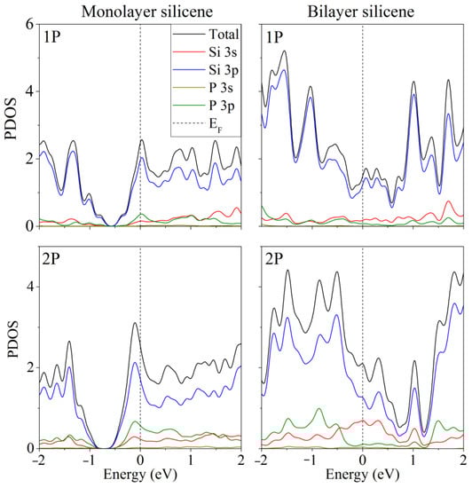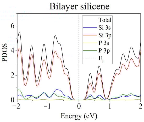 Doping of one- and two-layer free-standing silicene with phosphorus was studied in [48]. Representing them, the initial 2 × 2 supercells contained 8 and 16 Si atoms, respectively. In the quantum mechanical model, one or two Si atoms were replaced by P atoms. Electronic state spectra (PDOS) were calculated, the shape of which was used to track the change in the electronic properties of the doped two-dimensional material. In particular, it was noted that in most cases, as a result of doping, the energy gap between the valence band and the conduction band disappears, and silicene acquires conducting properties due to pp hybridization (Figure 2). However, in the case of two-layer silicene, the conductivity could not manifest itself when the substitution of Si atoms was carried out in the lower sublattices of the upper and lower layers of silicene. This procedure resulted in an increase in the band gap to 0.236 eV (see Figure 3).