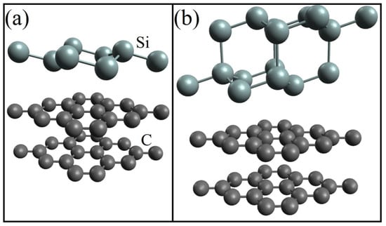 A DFT study of the electronic properties of doped silicene on a graphite substrate was performed in [46]. The number of C atoms in the two-layer graphite substrate was 36. Undoped systems with one- and two-layer silicene were preliminarily studied. The corresponding configurations obtained after geometric optimization are shown in Figure 4. After optimization, the distances between sublattices in each of the layers of two-layer silicene increased significantly, while the similar distance in single-layer silicene even slightly decreased.