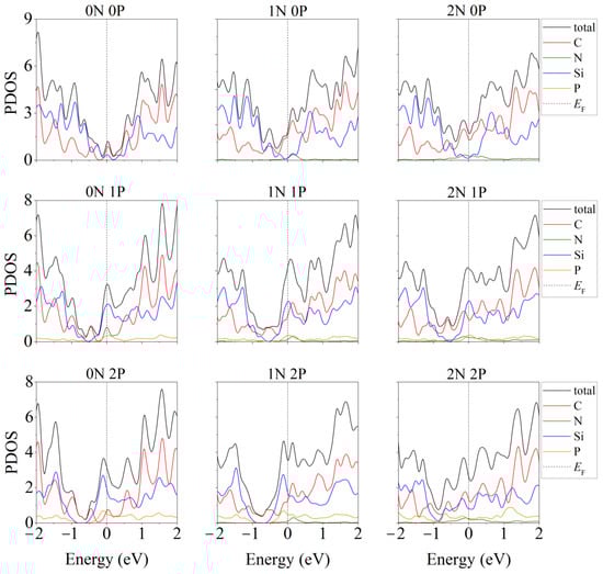 The partial densities of electronic states for this system are shown in Figure 5 [46]. As a result of nitrogen substrate doping, electronic conductivity always appeared in the system, regardless of whether silicene is doped. The same effect was achieved in the presence of one P atom in silicene. In this case, the substrate could be undoped. However, among the “two-layer silicene/carbon substrate” systems containing two phosphorus atoms, there may be semiconductors.