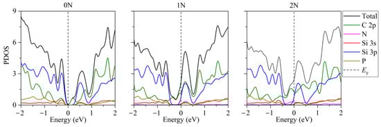 In the presence of two phosphorus atoms in the “two-layer silicene on a carbon substrate” system, when there are zero to two nitrogen atoms in the substrate, the partial densities of electronic states have the form illustrated in Figure 6 [46]. Extremely low electronic conductivity is observed in the absence of substrate doping. In this case, the band gap can range from 0.008 to 0.018 eV (Figure 6, 0 N). Whether the system will have the properties of a semiconductor depends largely on the arrangement of the P atoms in the silicene. In particular, this is realized in the case of an undoped carbon substrate for the following P localizations: 1. two atoms in the lower sublattice of the lower silicene sheet; 2. two atoms in the upper sublattice of the lower silicene layer; 3. one atom in the lower and one atom in the upper sublattice of the lower sheet of silicene; 4. one atom in the lower sublattice of the lower sheet and one atom in the upper layer of silicene. The PDOSs for cases 3 and 4 are almost identical. The phosphorus-doped silicene system always became conductive in the presence of nitrogen in the carbon substrate (Figure 6, 1 N, 2 N).
