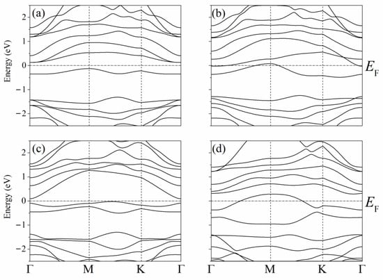 Band structures of silicene modified with one (a,b) or two (c,d) phosphorus atoms upon adsorption of one lithium atom in a position above the center of the six-membered ring; (a) and (b)—P atom is in the lower or the upper sublattice of silicene, respectively, (c)—two P atoms are in the lower sublattice or two P atoms are in the upper sublattice, (d)—one P atom is in the upper sublattice, and the other P atom is in the bottom one. Reprinted with permission from Ref. [45]. 2021, Elsevier.