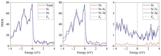 Unlike free-standing silicene, which is a narrow-gap semiconductor (Δ = 0.027 eV) [62], silicene on a nickel substrate in the absence of doping has barrier-free electronic conductivity. Detailed partial spectra of the electronic state density of such a system are presented in Figure 8 [45]. The conductivity in this case is explained by the interaction of Ni 3d electrons with Si 3p electrons.