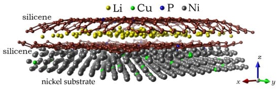 A lithium-filled channel with a 0.75 nm gap between the silicene sheets after 150 ps; the channel walls are doped with 3% phosphorus; a Ni substrate with 5% doping with Cu is used; the figure shows only the three closest to silicene channel layers of the metal substrate. Reprinted with permission from Ref. [39]. 2021, Elsevier.