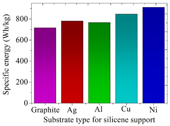 The specific energies of batteries with silicene anodes on metal (Ag, Al, Cu, Ni) and graphite substrates in the absence of doping were determined using the classical MD modeling method [63]. These data are presented in Figure 10, which shows that the substrate has a significant impact on this important battery characteristic. In particular, the use of a Ni substrate can increase the specific energy by 27% compared to the case of using a graphite substrate. The use of silicene anodes can increase the specific energy of the best modern batteries by 4–5 times on average.