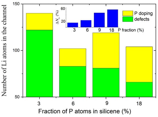 The effect produced by doping the walls of the silicene channel with phosphorus in the presence of a copper-doped nickel substrate, on the degree of its filling with lithium, is shown in Figure 11 [39]. As can be seen from the figure, the increase in the filling of the channel with lithium can be from 15% to 57%, depending on the degree of doping of the channel walls. An increase in the degree of doping leads to an increase in the doping-initiated contribution to channel occupancy. However, high doping reduces the mechanical stability of the channel walls, so that at 9% and 18% doping, the channel tends to break. Therefore, 3% doping of the silicene channel walls with phosphorus turns out to be optimal.