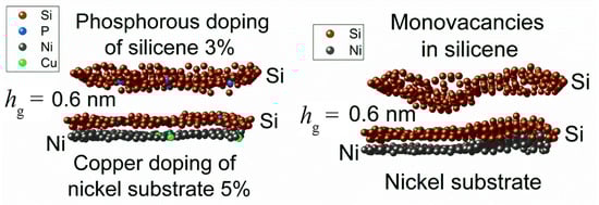 Zx-projections of the silicene channel (doped with phosphorous or modified with vacancies) and the top sheet of the Ni(111) substrate. Adopted with permission from Ref. [39]. 2021, Elsevier.