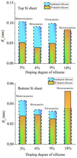 Calculated values of the roughness of the sheets of the silicene channel depending on the degree of doping of its walls with phosphorus (orange bars) or on the size of vacancies (blue bars); the Ni(111) substrates are 5% Cu doped and undoped in the presence of vacancies in silicene, respectively. Adopted with permission from Ref. [39]. 2021, Elsevier.