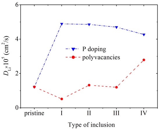 Diffusion coefficient of Li ions during their movement along a pristine silicene channel and a channel whose walls contain P atoms and polyvacancies: I, II, III, IV—mono-, bi-, tri-, and hexavacancies in silicene, respectively; in all cases, the silicene channel is located on a graphite substrate with a nitrogen content of 5%. Adopted with permission from Ref. [11]. 2021, Elsevier.