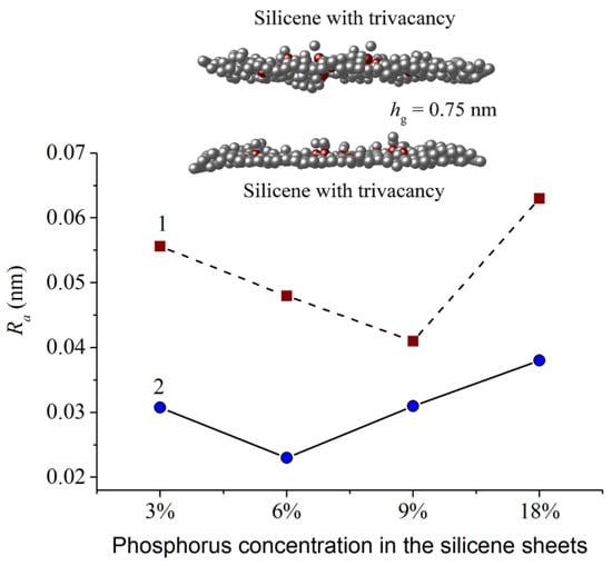 Roughness of the top (1) and bottom (2) silicene sheets of the system “P-doped silicene channel located on the 5% N-doped graphite substrate” with different phosphorus concentrations; insert shows zx-projection of the silicene channel with the 9% phosphorus concentration. Reprinted with permission from Ref. [11]. 2021, Elsevier.