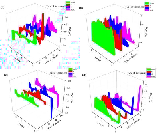 Stress distribution in a lithium-intercalated silicene channel with defects initially filled with P atoms; the channel with a gap of 0.24 nm is located on a graphite substrate, which has 5% doping with nitrogen; (a,b) show the distribution of stresses σzx and σzz along the direction 0 x (zig-zag); (c,d) show the distribution of stresses σzy and σzz along the direction 0 y (armchair); types of defects filled with P atoms: I, mono-, II, bi-, III, tri-, and IV—hexavacation. Reprinted with permission from Ref. [46]. 2020, Springer.