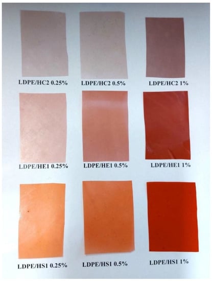 The LDPE/hematite composites, named LDPE/HC2, LDPE/HE1, and LDPE/HS1, were prepared by mixing in a Brabender kneader at a temperature of 180 °C over a period of 3 min with a speed of kneading of 45 rpm. The contents of hematite in the samples were 0.25, 0.5, and 1% (Table 1). For further characterization, the obtained composite materials were shaped into the foils (Figure 1) and plates by pressing using a hydraulic press (Dake model 44-226) at a temperature of 190 °C.