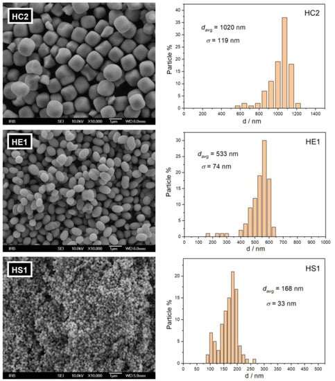 The sizes and shapes of the synthesized hematite particles were observed using scanning electron microscopy. Pseudocubic, ellipsoidal, and spherical hematite particles of average diameters of 1020 ± 119 nm, 533 ± 74 nm, and 168 ± 33 nm are present in samples HC2, HE1, and HS1, respectively (Figure 2).