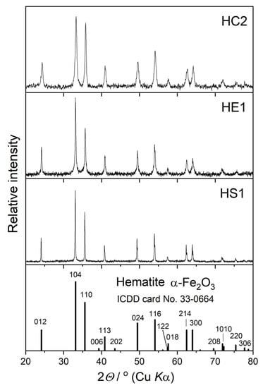 The powder X-ray diffraction (PXRD) patterns of the synthesized samples are shown in Figure 3. All patterns match well with the standard hematite diffraction pattern (ICDD PDF card No. 33-0664) with no additional diffraction lines of other crystalline phases. A significant difference in the width of the diffraction lines in these three PXRD patterns suggests differences in the crystallite sizes of the prepared hematite samples. The average crystallite size in the prepared samples, estimated using the Scherrer equation [21], is inversely proportional to the particle size: 22 nm for sample HC2, 54 nm for sample HE1, and 90 nm for sample HS1. According to these results, the largest, pseudocubic particles (sample HC2) consist of thousands of nanosized subcrystals, and the ellipsoidal particles (sample HE1) consist of hundreds of subcrystals, while the smallest, spherical particles are composed of only a few subunits. The sizes of the hematite particles and crystallites had significant influence on various properties (optical, electronic, magnetic, photocatalytic, etc.) [14,15,16,17,18].