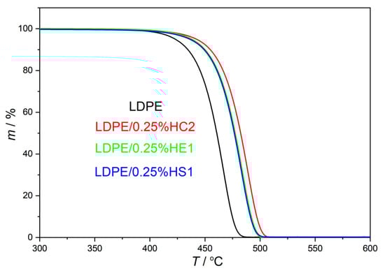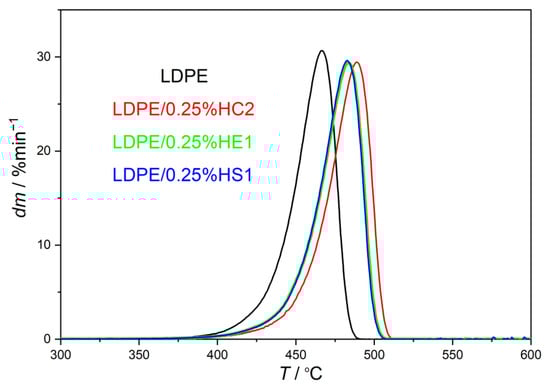 The initial decomposition temperature of the samples (T95%) is studied to compare the beginnings of thermal decomposition of the samples. It represents the temperature where 5% of the sample is decomposed and 95% of the sample remained. The results, presented in Table 2 and Figure 4 and Figure 5, show that all studied composite samples have higher T95% than the pure LDPE. The increase in such stability is the consequence of the hematite presence in composites, which contributes to the thermal resistance of the LDPE. The highest value of T95% is obtained for the sample LDPE/0.25%HC2 (442.92 °C), which shifted even more than 20 °C toward a higher temperature compared to the pure LDPE polymer (422.60 °C). It can be explained by the presumed changed molecular mobility of polymer chains, which are adsorbed on the surface of hematite particles in the composite. Restricted motions of polymer chains attached to the surface of hematite particles cause better stability of composites compared to the pure LDPE polymer [22]. Furthermore, there is no significant difference between the start of the thermal decomposition when the higher content of the filler is used. The content of the filler of only 0.25% causes the quite strong shift at the beginning of thermal decomposition to the higher temperatures for all types of hematite (HC2, HE1, and HS1). It can be supported by the fact that the small size of the filler particles due to their high surface-to-bulk ratio can considerably improve thermal properties of the polymer matrix even when a very low filler content is used [1].