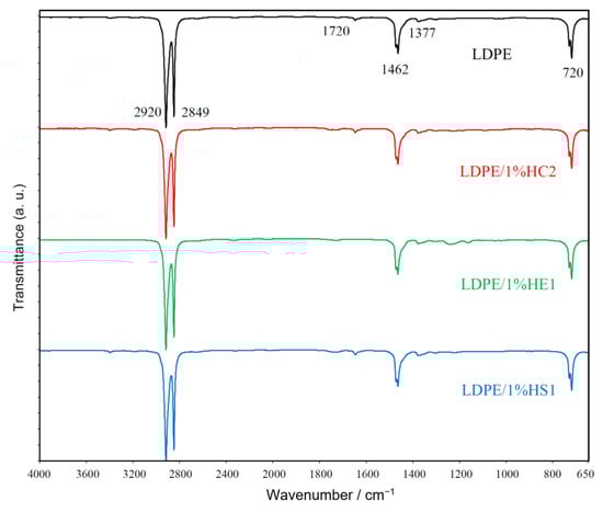 Figure 6 presents FTIR spectra of LDPE polymer and LDPE/1%HC2, LDPE/1%HE1, and LDPE/1%HS1 composite samples. The spectra reveal characteristic vibrations for polyethylene polymer: peaks of strong intensity for CH2 asymmetric stretching at 2920 cm−1 and CH2 symmetric stretching at 2849 cm−1; a peak at 1462 cm−1 which corresponds to bending deformation and a peak at 720 cm−1, which corresponds to rocking deformation. A weak peak at 1377 cm−1, which represents CH3 symmetric deformation [23,24,25], is also observed.
