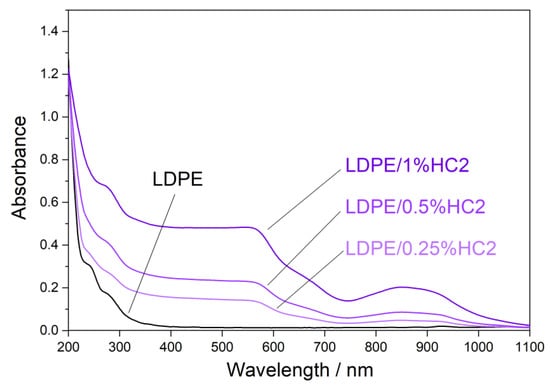 Absorbance UV-Vis-NIR spectra (obtained from diffuse reflectance) of LDPE and LDPE/HC2 composites.
