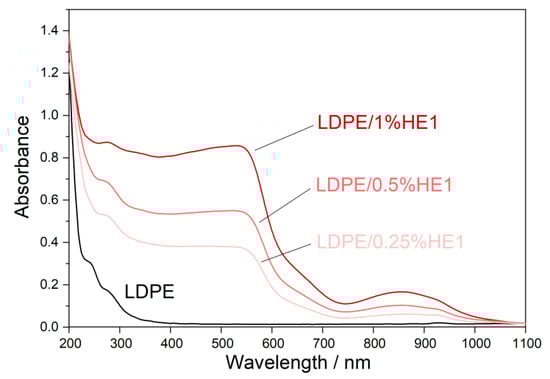 Absorbance UV-Vis-NIR spectra (obtained from diffuse reflectance) of LDPE and LDPE/HE1 composites.