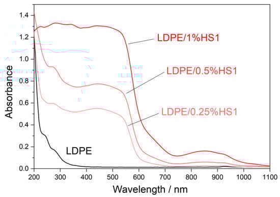 Absorbance UV-Vis-NIR spectra (obtained from diffuse reflectance) of LDPE and LDPE/HS1 composites.