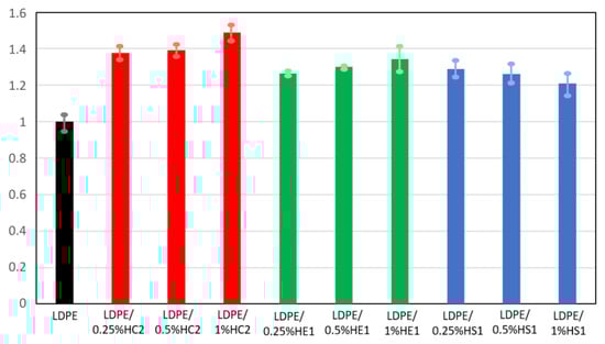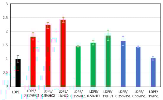 The mechanical properties of some types of polymers can be significantly improved using hematite as a filler where it contributes to the enhancement of these properties. It is also known that mechanical properties depend on filler content and its aggregation as well as on polymer viscosity [3,30]. The results of the mechanical properties of pure LDPE and LDPE/hematite composites are presented in Figure 10 and Figure 11, expressed as relative tensile strength and relative elongation at break. The tensile strength and elongation at break of the prepared composites are expressed in relation to the tensile strength and elongation at break of the pure LDPE. Pure LDPE is used as a reference material and its tensile strength and elongation at break are expressed as value 1. The unit for measured tensile strength was Nmm−2, while for elongation at break it was %.