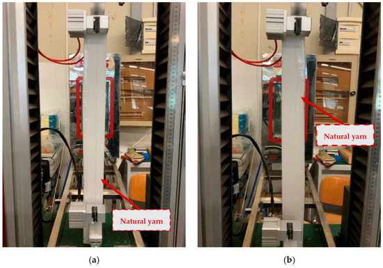 The tests were carried out with the aim of obtaining a mechanical characterisation of the yarns that complied with the regulation “BS ISO 3341:2000 EUR [30], which refers to machines with a constant rate of elongation (CRE) and flat clamps with an indicated nominal gauge length of 500 mm. Samples were randomly extracted from the textile: 10 yarns were tested for each textile. Tensile tests were performed by means of a CMT4000 SANS Series dynamometer (MTS, Shenzhen, China) in displacement control with a rate of 200 mm/min ± 20 mm/min. (Figure 2). The load and elongation were recorded during the test.