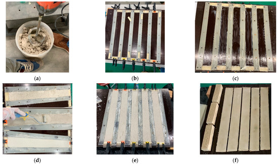 Preparation of TRMs specimens: (a) Making of mortars; (b) Formworks; (c) Laying of release agent; (d) Making of NTRM; (e) NTRMs specimens before hardening; (f) End of NTRMs making process.