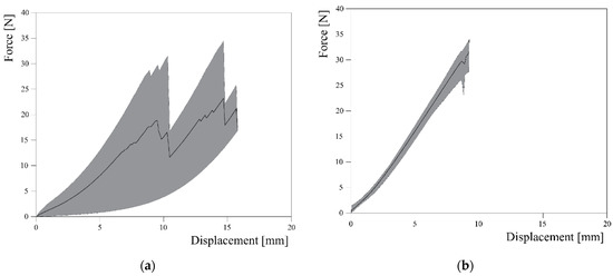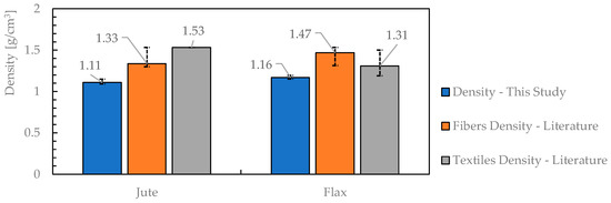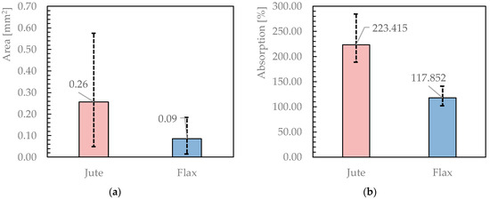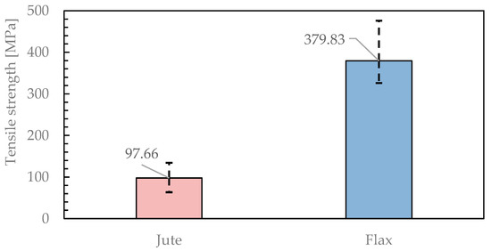 Table 1 reports the main results of this analysis, which highlight how the flax textile mesh was denser than the jute one. In addition, it is worth mentioning that the jute yarn is extremely uneven and “frayed”, while the flax yarn is homogeneous and compact.