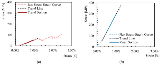 The third stage arises when all the cracks are formed on the TRM system the total number of them (or equivalently, their average distance) is affected by both the adhesion between fabric and matrix and the tensile strength of the latter. As the cracks are stabilised, the tensile strength of the TRM is controlled by the reinforcing fabrics, which is why in Figure 16, for both Jute and Flax, the final branch of the stress–strain curve has a fairly linear shape characterised by similar slopes and ultimate strengths. In this regard, Figure 16 confirms that the Flax fabric is stiffer and stronger than the Jute fabric considered in this study.