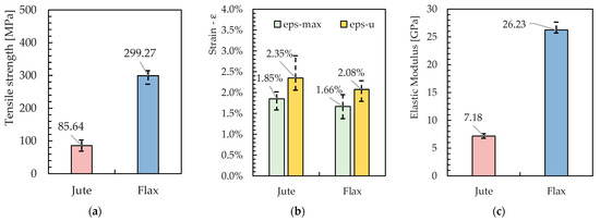 (a) Average of the maximum tensile strength, for jute and flax; (b) Average of the maximum Young Modulus, for jute and flax; (c) Maximum strain and ultimate strain at break for jute and flax.