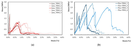 Stress–strain curves of Jute-TRM (a) and Flax-TRM (b).
