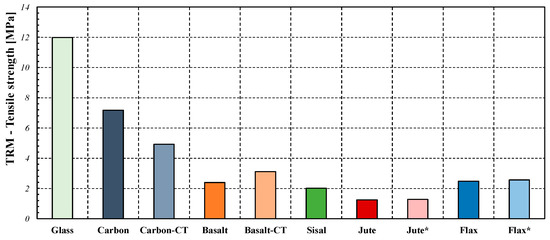 It is also relevant to compare the results obtained in the present study with what is reported in the literature. To this aim, Figure 18 shows a bar chart reporting the average values of the ultimate strengths obtained from tensile tests on TRM systems with hydraulic lime-based matrices and one single layer of reinforcing fabric. Specifically, the cases of both more conventional fibres (i.e., glass, carbon, or basalt) and natural materials (i.e., sisal, flax, and jute) are taken into account [2,14,33,37,39,40,41]. All the results included in the assembled database are obtained from tensile tests executed in compliance with the RILEM recommendation [13] and adopting both the “clevis” system and a free length ranging from 300 mm to 370 mm.