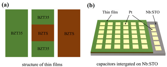 (a) Structure of BZT35 and BZTS single-layer and BZT35/BZTS/BZT35(1:1:1) sandwich structure multilayer films. (b) Diagram of capacitors integrated on Nb:STO.