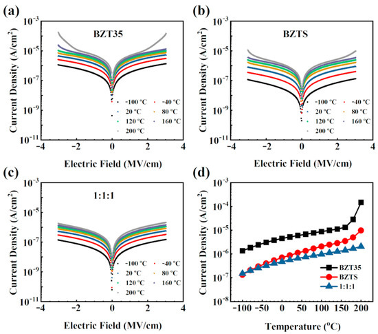 The schematic structure of thin films and capacitors integrated on Nb:STO were shown in the Figure 1. For the sandwich structure multilayer thin film, BZTS with a high breakdown electric field (Eb) was used as core layer and BZT35 was used as the outer layer. In order to unveil the relationship between the leakage behavior and structure, the samples of BZT35, BZTS, and BZT35/BZTS/BZT35(1:1:1) were chosen as model. The leakage current density of them at the temperature range of −100~200 °C was investigated, as shown in Figure 2a–c. It can be seen that the leakage current density J increase with increasing the temperature under the same electric field for all samples of BZT35, BZTS, and BZT35/BZTS/BZT35(1:1:1). However, when the temperature exceeds a certain level, it can be seen that J increases sharply under a high electric field for BTZ and BZT35 monolayer films. It can be seen more clearly from the Figure 2d that the leakage current density of these three samples is JBZT35/BZTS/BZT35(1:1:1) < JBZTS < JBZT35. When the temperature above 160 °C, the J of BZT35 film increased by 11.5 times from 1.3 × 10−5 A/cm2 at 160 °C to 1.5 × 10−4 A/cm2 at 200 °C, and the J of BZTS increases 2.8 times. This is because the SiO2 has a large band gap and good insulation, and a small amount of SiO2 doping can improve the insulation of the BZT film and reduce the leakage current. In contrast, the J of BZT35/BZTS/BZT35(1:1:1) increases only 1.5 times from 1.4 × 10−6 A/cm2 at 160 °C to 2.1 × 10−6 A/cm2 at 200 °C. The lowest leakage current density BZT35/BZTS/BZT35(1:1:1) in a wide range of temperature makes it have a higher breakdown electric field, and achieves high energy storage density Wre at 200 °C in our previous report [17].