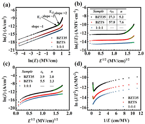 The ln(J) vs. ln(E) (a), ln(J/E) vs E1/2 (b), ln(J) vs E1/2 (c) and ln(J/E2) vs. 1/E (d) for BZT35, BZTS and BZT35/BZTS/BZT35(1:1:1) films under 200 °C.