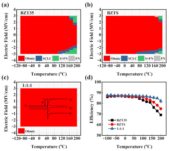 To have a more intuitive understanding of the leakage behavior of BZT35, BZTS, and BZT35/BZTS/BZT35(1:1:1) at different temperature, the conduction mechanism under both positive and negative biases at different temperatures are shown in Figure 4a–c. It can be seen that there is only bulk-limited conduction (Ohmic conduction and SCLC behavior) at low temperature under the electric field of −3.0 MV/cm to 3.0 MV/cm for BZT35 and BZTS films. With the increasing of temperature, it shows interface-limited conduction mechanism of F-N tunneling at a negative bias under a high electric field (120 °C) and then S emission co-exists with F-N tunneling at high temperature (140 °C) for negative bias, 160 °C for positive bias for BZT35 films, as shown in Figure 4a, which causes the energy storage density to decrease sharply, as shown in Figure 4d. For BZTS films, as shown in Figure 4b, the interface-limited conduction mechanism of F-N tunneling at both negative and positive biases under a high electric field (160 °C) and then S emission co-exists with F-N tunneling at high temperature (180 °C). This means that the interface-limiting conduction mechanism is narrower than BZT35 film, and the doped SiO2 is beneficial to obtain a relatively lower leakage current. It is exciting that only Ohmic conduction is found in the temperature range from −100 °C to 200 °C under the tested electric field for BZT35/BZTS/BZT35(1:1:1) film, as shown in Figure 4c. The conduction can be described from the insert energy band diagram in Figure 3c: the electrons obtain activation energy Φ, and transition to the conduction band of the dielectric material to form conduction. This indicates that BZT35/BZTS/BZT35(1:1:1) sandwich structures can effectively block the thermal excitation of electrons and prevent the electrons from traps into the conduction band of the dielectric. From the energy storage efficiency η under the different temperature of these three samples at 3 MV/cm showed in Figure 4d, it can be seen that the η decreases with increasing the temperature for all of them, and the η of BZT35 decreases more quickly than BZTS, especially at high temperature. The trend of ηBZT35/BZTS/BZT35(1:1:1) > ηBZTs > ηBZT35 (in Figure 4d) and JBZT35/BZTS/BZT35(1:1:1) < JBZTS < JBZT35 (in Figure 2d) shows that the η is closely related to the leakage current of the film, the higher leakage current, the lower η. This proves that the sandwich structure film of BZT35/BZTS/BZT35(1:1:1) successfully reduces the leakage current of the material at high temperature, thus achieving high breakdown field strength and excellent energy storage performance at high temperature.