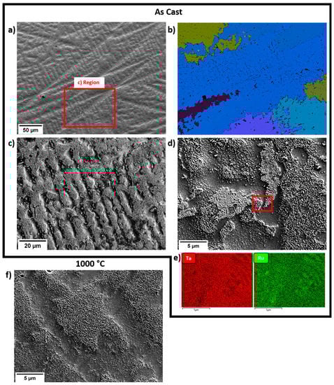 (a) 20 kV Secondary electron SEM micrograph of the as cast Ta72Ru28 alloy and (b) corresponding EBSD euler map. All points were indexed as BCC. (c,d) show higher resolution secondary electron images of the as cast alloy. (e) Low voltage (5 keV) EDX maps from the red box in (d) showing qualitatively more Ru in the white regions. (f) Secondary electron SEM micrograph of the aged Ta72Ru28 alloys, showing the similar distribution of regions as the as cast alloy.