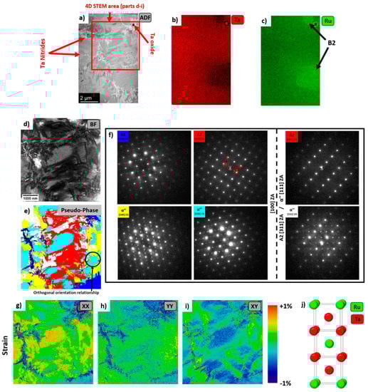 The 4D-STEM data was used to calculate strain maps, Figure 4g–i, which were measured with reference to an A2 diffraction pattern. These have been included to show the coherency between the A2, B2 and α’’ phases along different crystallographic directions. The XX and YY directions were set parallel/perpendicular to the 001 directions in the A2 crystal and are shown in Figure 4f,g, respectively. Figure 4i shows the corresponding shear component of the strain.