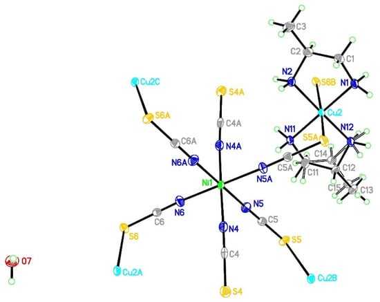 The reported complex crystallizes in a monoclinic C2/c space group with the nickel ions positioned at a twofold axis. In the asymmetric unit, there are copper and nickel ions, three linear thiocyanate ligands (N-C-S angles: 178.9(4)–179.6(4)°), two 1,2-diaminepropane molecules and one water molecule (Figure 1). The selected bond lengths and angles are presented in Table 2 and Table S1, Supplementary Materials. Carbon atoms in pn molecules reveal positional disorder with occupancy 0.55 (C12 and C13) and 0.45 (C14 and C15). Copper(II) ions adopt 4+2 coordination with four short Cu-N and two much longer Cu-S bonds. The Cu-N bonds are found in the range 2.003(3)–2.028(3) Å and are similar to the values found in other complexes [27,31,76,77,78]. The axial bonds are distinctly longer than equatorial bonds and are equal to 2.9883(11) and 3.0224(10) Å for Cu-S5 and Cu-S6, respectively. Therefore Cu-N and Cu-S distances are characteristic of the geometry of the elongated octahedron [31,79]. Nickel(II) ion was found in a slightly distorted octahedral environment, with six Ni-N bonds being as follows: 2.060(3), 2.073(3) and 2.118(4) Å. These values correspond to those found in the literature [44,54]. The longest distance was found for the non-bridging thiocyanate ions indicating that a bridge formation resulted in a shortening of Ni-N bonds. The selected valence angle description is given in the Supplementary Materials.