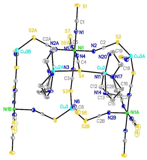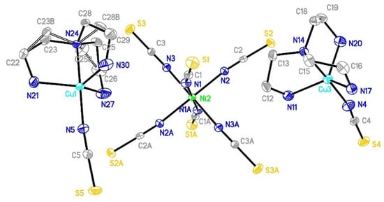 Compound 3 crystallizes in a monoclinic P 21/c space group with Ni2 ion located at the inversion center, and the Cu:Ni ratio is 4:1 (Figure 5). The selected bond lengths and angles are presented in Table 4 and Table S5, Supplementary Materials. The positional disorder (55:45) is observed for carbon atoms of the tren (N24) molecule. Ni1 is found in a slightly distorted octahedral environment formed by six nitrogen atoms of thiocyanate anion. Ni-N distances range from 2.075(3) to 2.102(3) Å. There are two [Cu(tren)(NCS)]+ units with pentacoordinate copper(II) cations with τ5 values (0.773 and 0.877 for Cu1 and Cu3, respectively) [85], indicating the distorted trigonal bipyramidal environment with threefold axes of both Cu1 and Cu3 coordination spheres inclined by 58.0°. Both Cu(II) coordination spheres consist of five nitrogen atoms—four coming from the tripodal ligand and one of the thiocyanate anion. Three nitrogen atoms from pendant -CH2-CH2-NH2 groups are found in the equatorial plane with Cu-Ntren distances from 2.041(3) to 2.128(3) and from 2.061(3) to 2.109(3) Å for Cu1 and Cu3 coordination spheres, respectively. The apical positions are occupied by central N14 (2.042(2) Å) or N24 (2.034(2) Å) atoms from tren molecules and N4 (1.950(3) Å) or N5 (1.941(3) Å) atoms from thiocyanates forming the shortest bonds in Cu(II) coordination spheres. Very similar coordination spheres were found in isomorphic [Cu(tren)(NCS)]4[Mn(NCS)6] complex (1.941(2)–2.156(2) Å) [22], mononuclear [Cu(NO2)(tren)]2(PF6)2 complex (2.0410(19)–2.1352(17) Å) [91] and [Cu(tren)(acv)]X2 (acv = acyclovir, X = NO3−, ClO4−, 2.050(4)–2.149(5) and 2.0538(19)–2.1256(19) Å, respectively) (2.149(5) and 2.1256(19) Å) [92]. In [MoIV(CN)2(CN-Cu(tren))6]8+, where the copper units are radially connected to the central molybdenum(IV) cations, Cu-Ntren bonds in the copper coordination spheres show a much bigger range with one very short contact (usually below 2.0 Å) and other spanning from 2.03 to 2.15 Å [93]. For trinuclear unit coupled into hexanuclear [Cu6(tren)2(N3)12] clusters arranged in centrosymmetric zigzag instead of the long bond, there is one very short bond between lateral -CH2-CH2-NH2 chain and copper(II) ion (1.997(6) to 2.065(5) Å) [94]. The selected valence angle description is given in the Supplementary Materials.